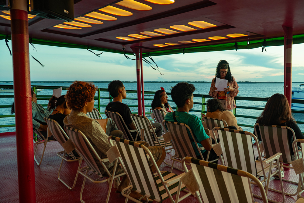 Há mais de dois meses, o ferryboat, projetado pelo artista boliviano Freddy Mamani, saiu de Belém (PA) para iniciar sua viagem pelos rios da Amazônia. Com a missão de promover encontros e espalhar arte, cultura e educação, o projeto já visitou as cidades de Marabá (PA), Tucuruí (PA), Cametá (PA), Santarém (PA), Óbidos (PA), Oriximiná (PA), Juruti (PA), Parintins (AM), Itacoatiara (AM) e Iranduba (AM). A Bienal das Amazônias Sobre as Águas tem patrocínio master do Nubank e do Instituto Cultural Vale, por meio da Lei Federal de Incentivo à Cultura.